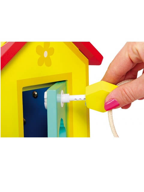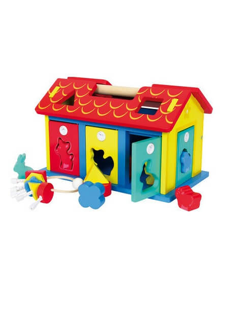 Ova kuća sa raznim oblicima, čvrsta je kombinacija šperploče i bukve u boji, pomaže u prepoznavanju oblika i boja! Odlična motorička vježba sa zaključavanjem i otključavanjem vrata odgovarajućim ključevima. Krovne ploče se mogu otvoriti.