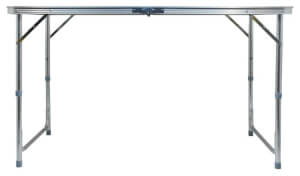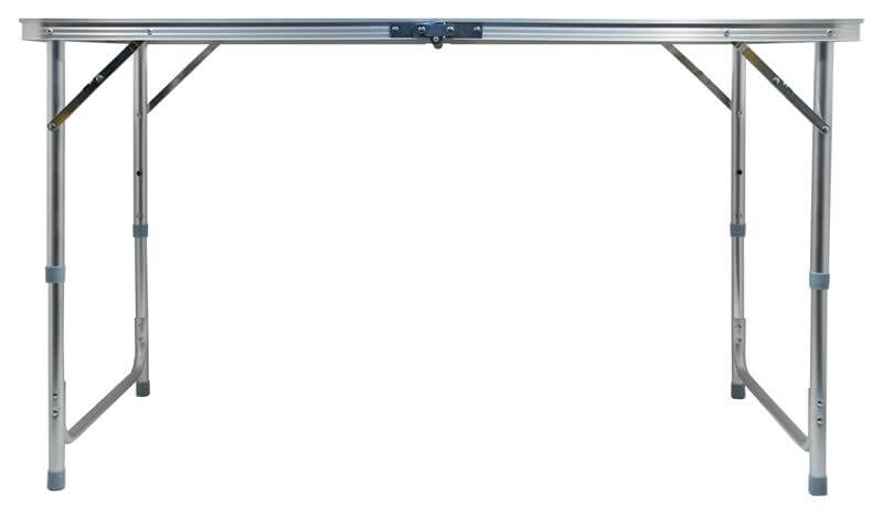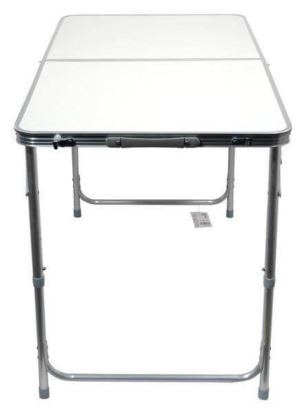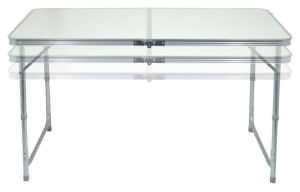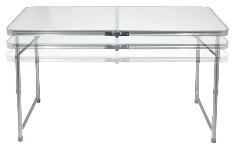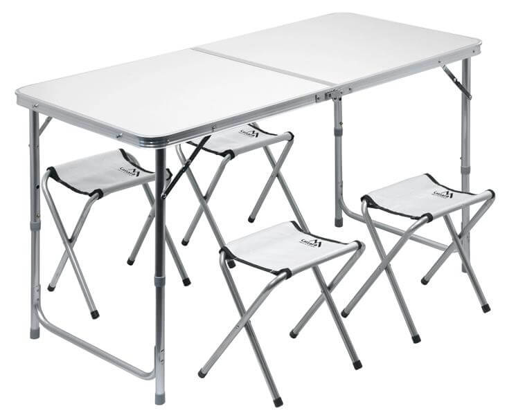 Dvostruki stol je sklopivi, teleskopski stol izrađen od aluminija, ravne površine s bijelim uzorkom, s četiri sklopive stolice.
